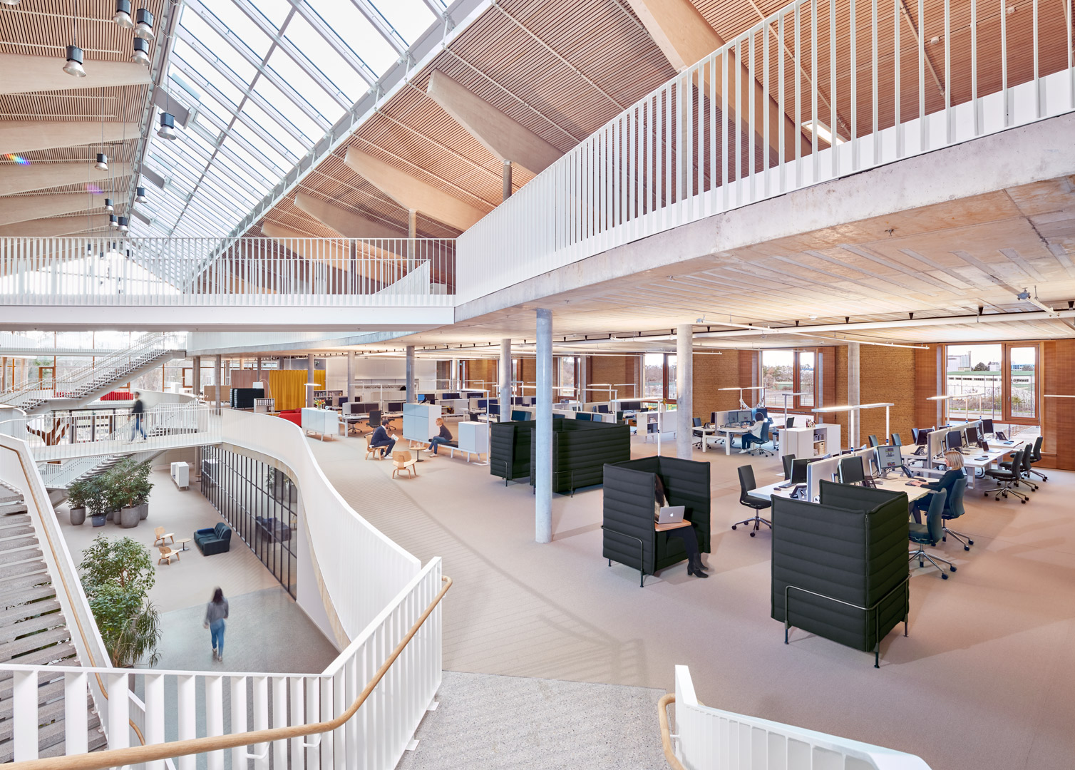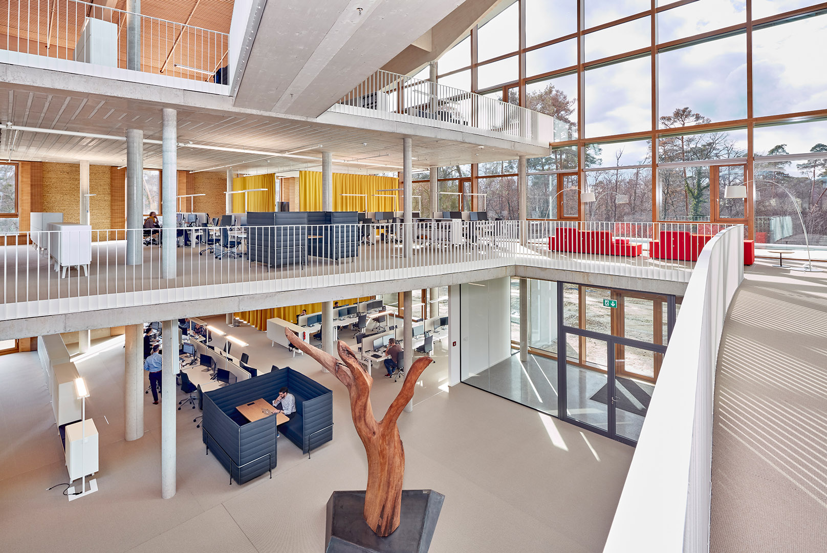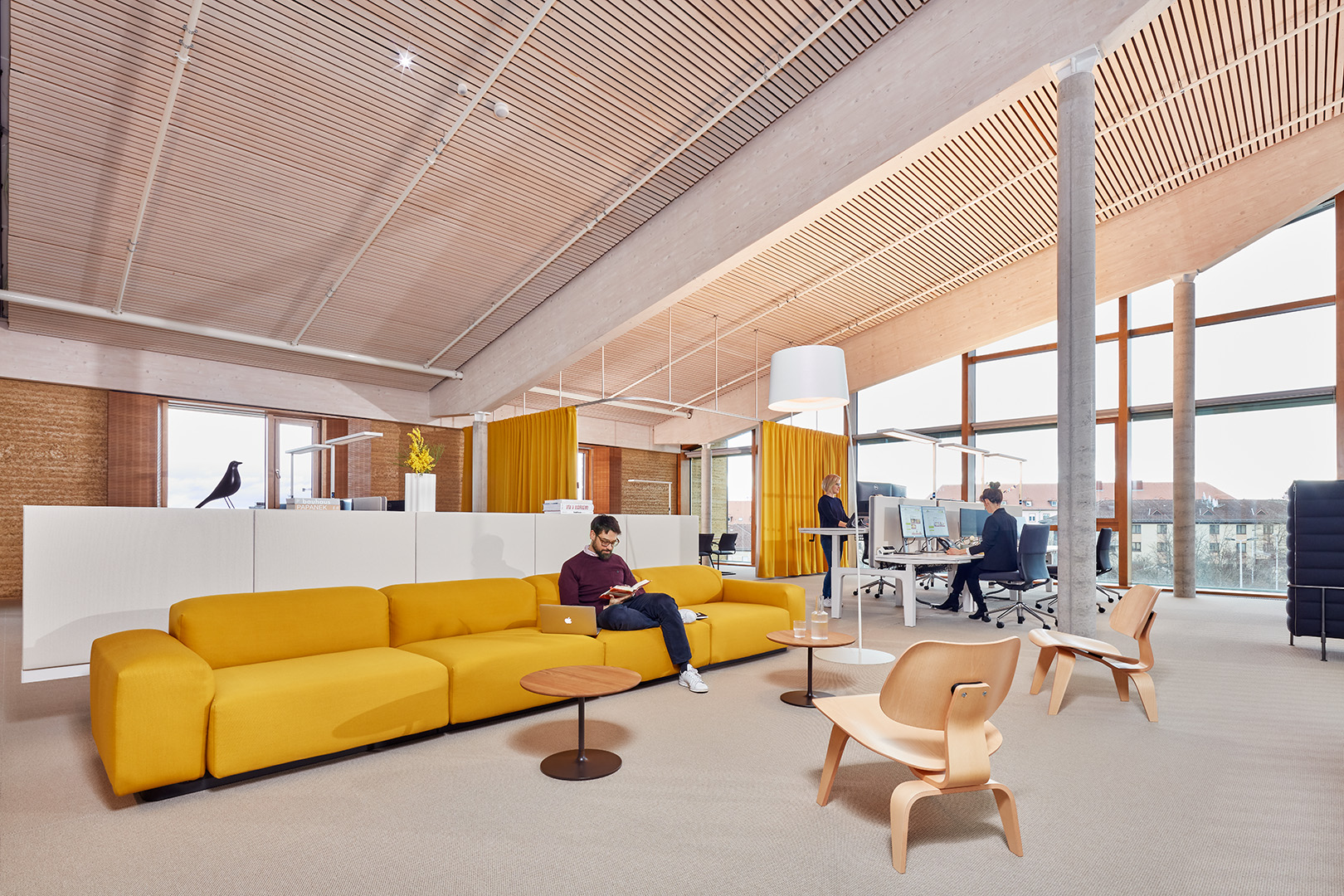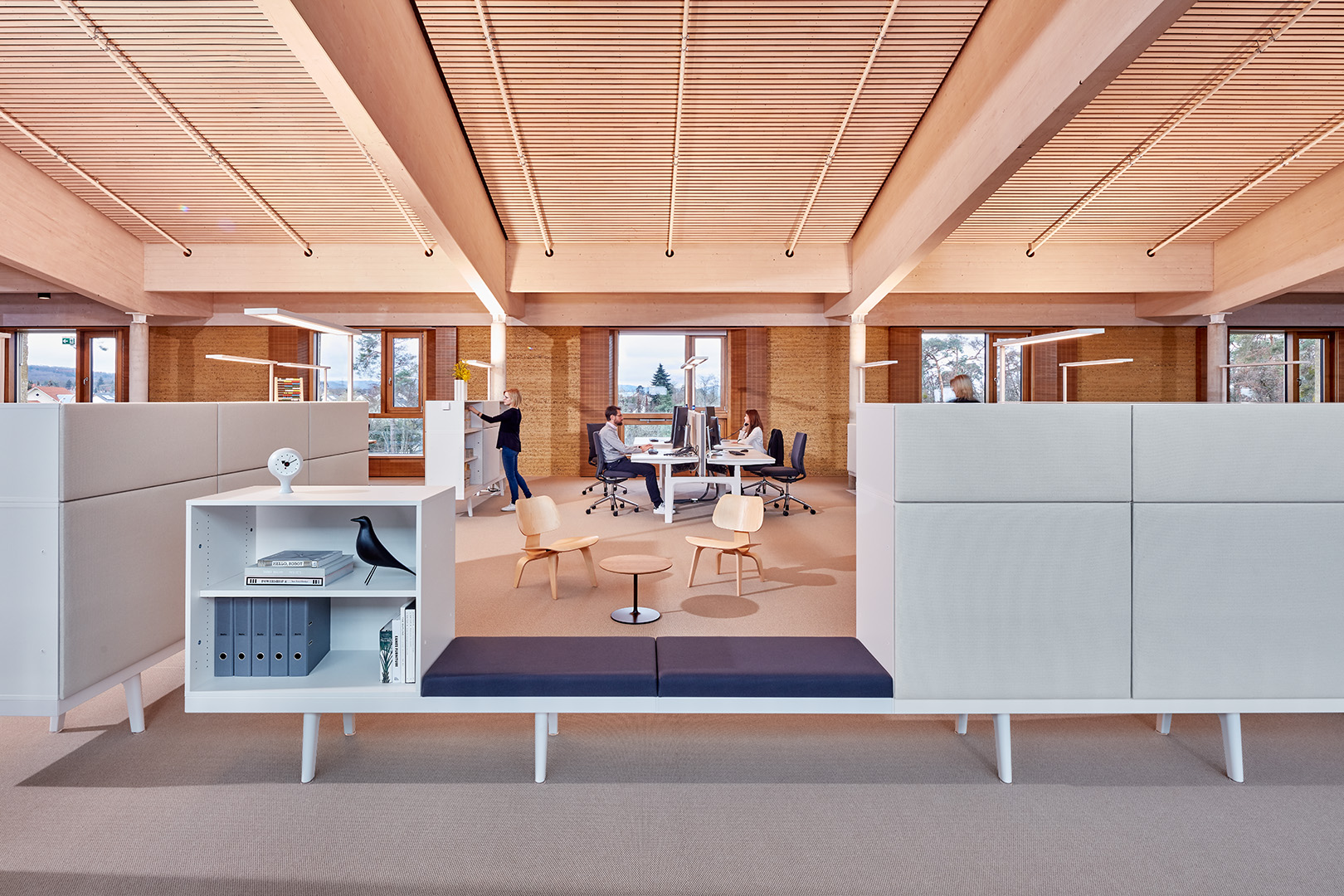 "The 'Alnatura Campus' is located on the site of former barracks in southwest Darmstadt. For the planning and implementation of the project, the organic grocery chain embraced the highest standards of modern work culture and sustainability. Their collaboration with Vitra produced an open-plan work environment in Europe's largest office building with a rammed-earth façade. In designing the two-storey office space with work islands, meeting zones and quiet areas for individual retreat, Vitra analysed the company's space requirements and use of workstations, and employees were invited to participate in workshops during the planning phase with a project-specific sample library of structural elements, furniture and lighting. Alnatura had already outfitted its previous offices with Vitra products. As these were still in good condition after up to 25 years of use, it was decided to promote sustainability by keeping these furnishings and integrating them in the new interior.