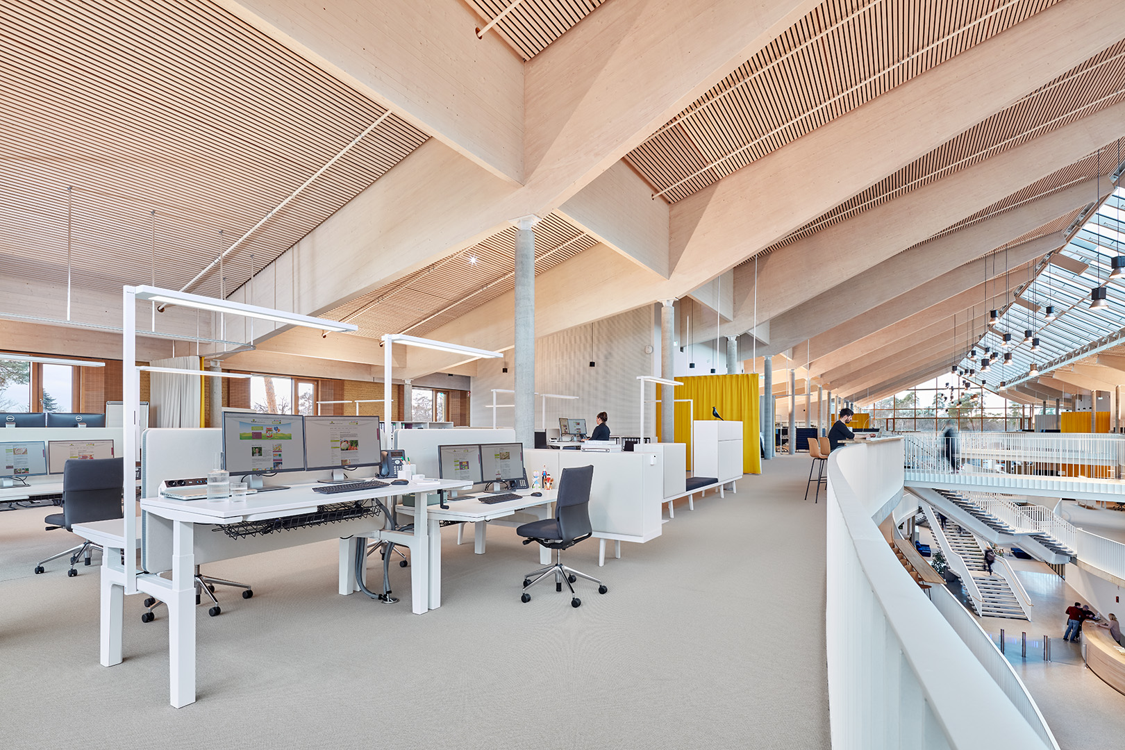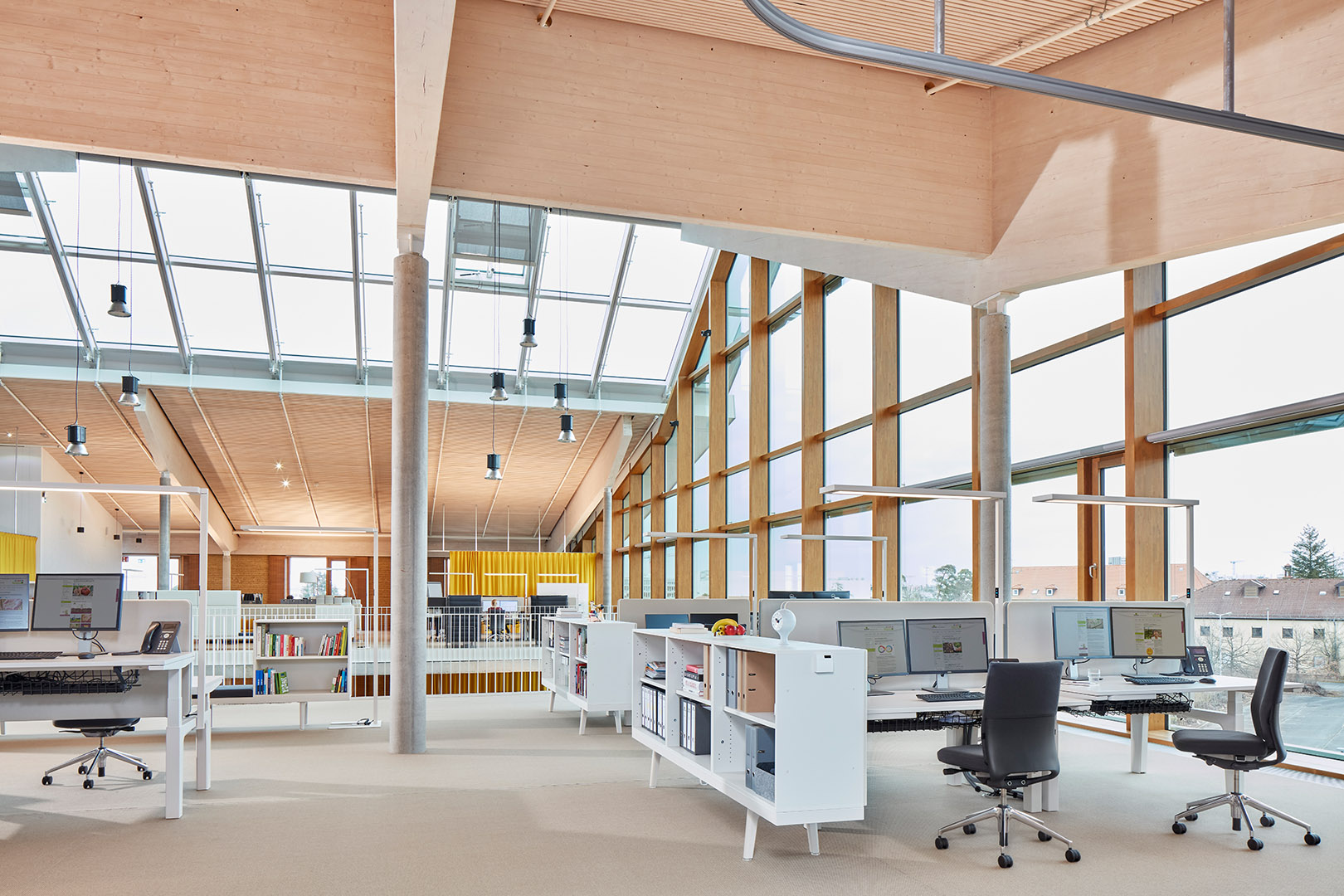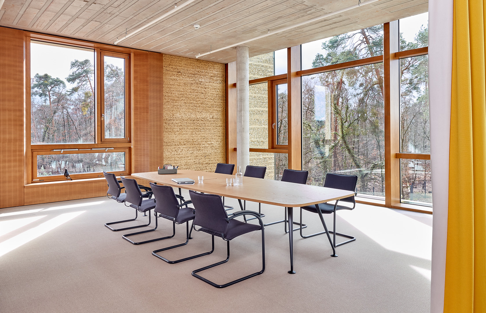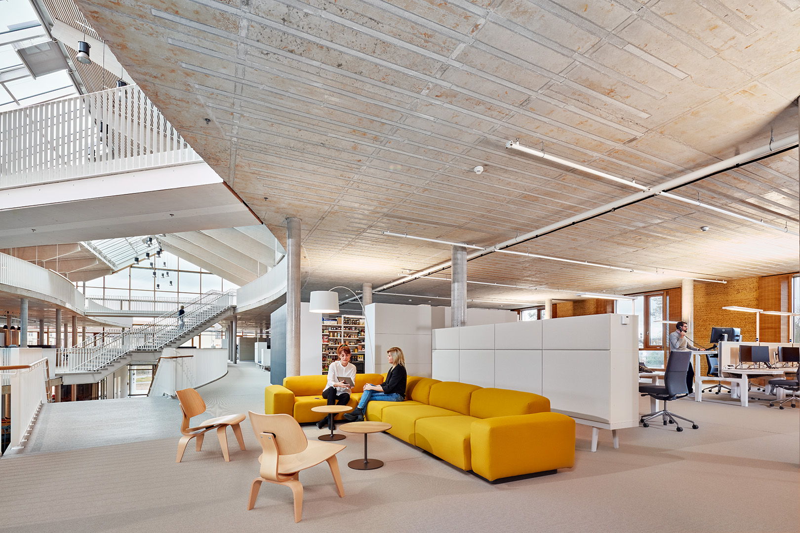 "The 'Alnatura Campus' is located on the site of former barracks in southwest Darmstadt. For the planning and implementation of the project, the organic grocery chain embraced the highest standards of modern work culture and sustainability. Their collaboration with Vitra produced an open-plan work environment in Europe's largest office building with a rammed-earth façade. In designing the two-storey office space with work islands, meeting zones and quiet areas for individual retreat, Vitra analysed the company's space requirements and use of workstations, and employees were invited to participate in workshops during the planning phase with a project-specific sample library of structural elements, furniture and lighting. Alnatura had already outfitted its previous offices with Vitra products. As these were still in good condition after up to 25 years of use, it was decided to promote sustainability by keeping these furnishings and integrating them in the new interior.