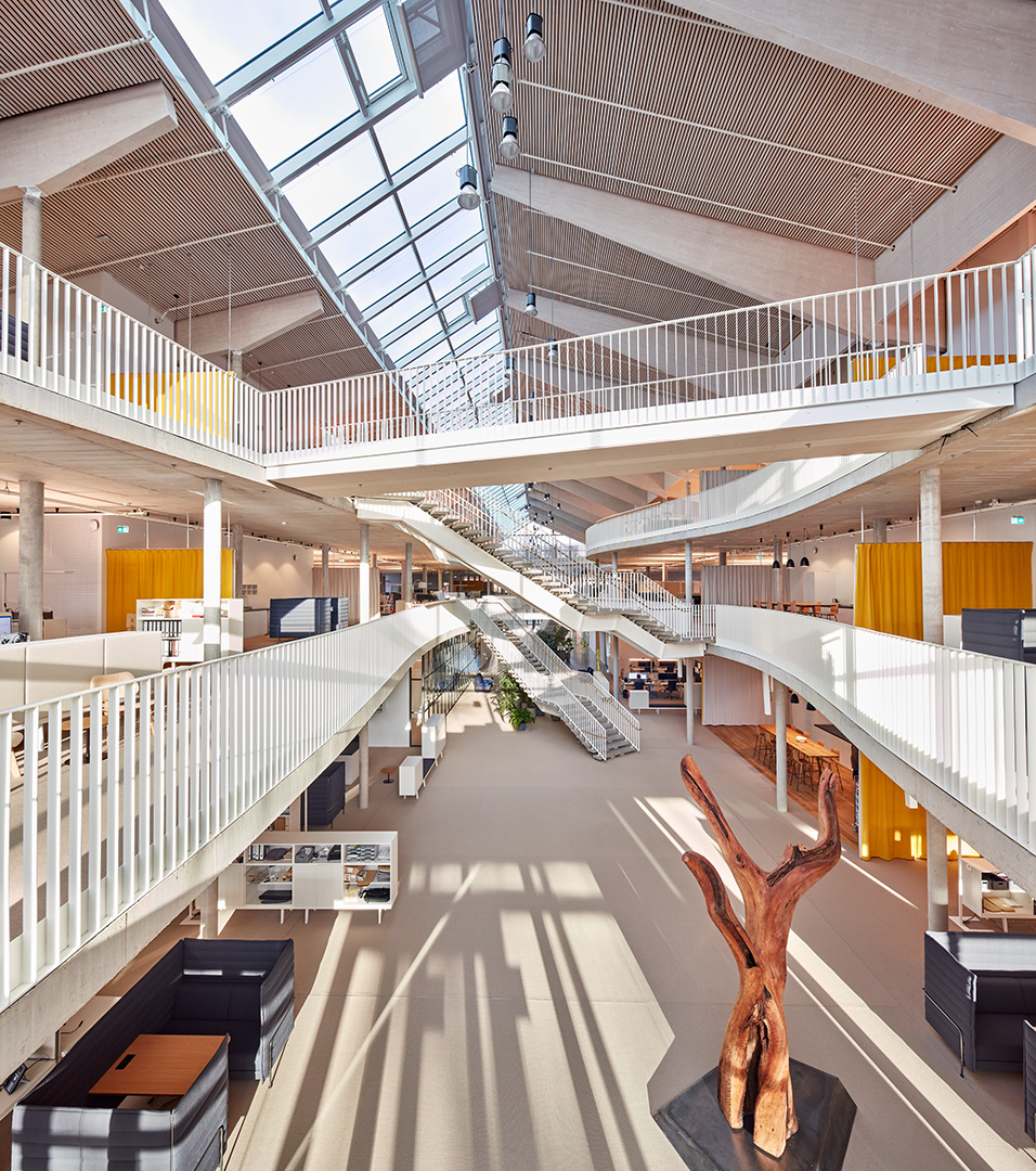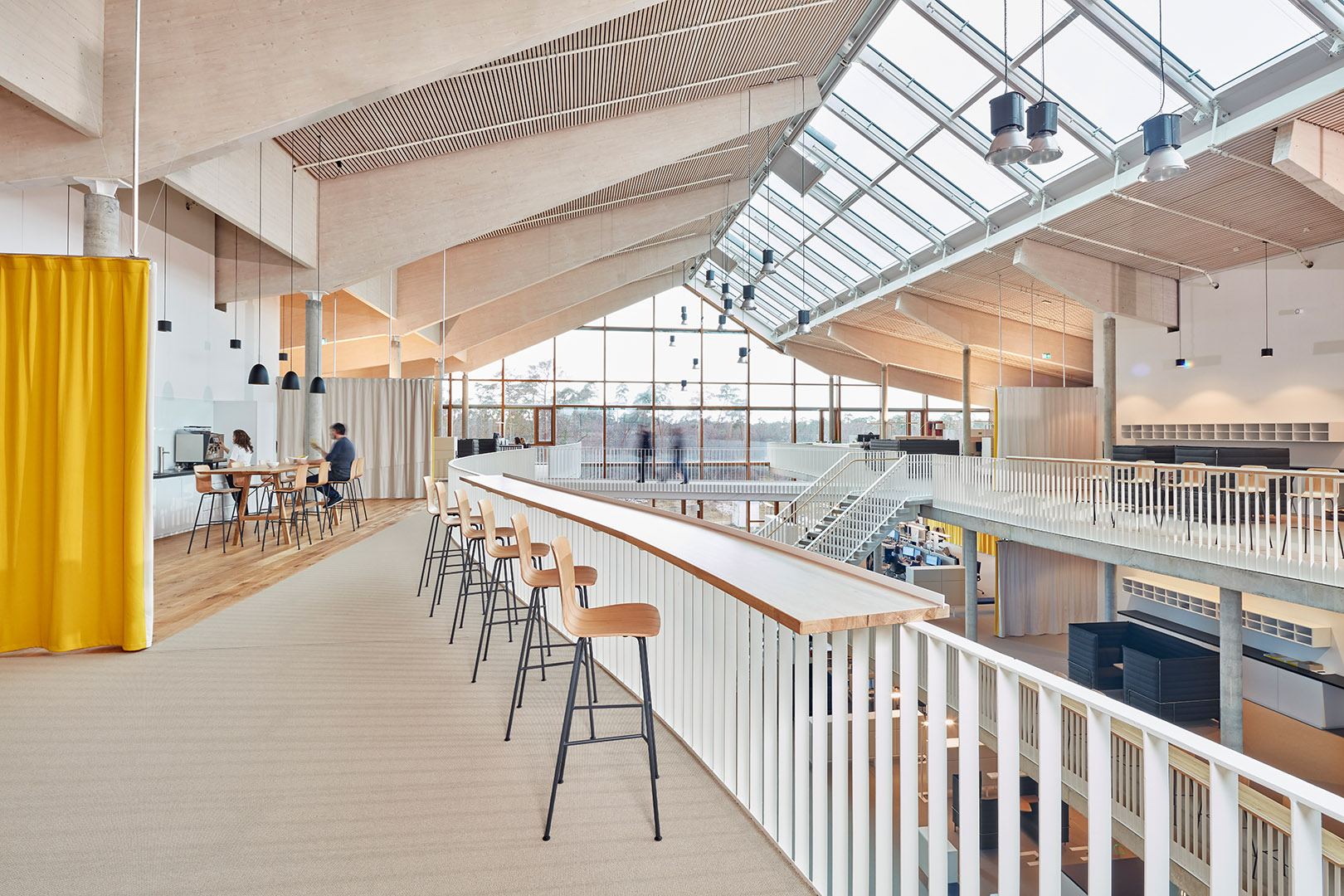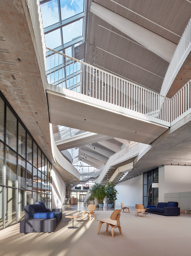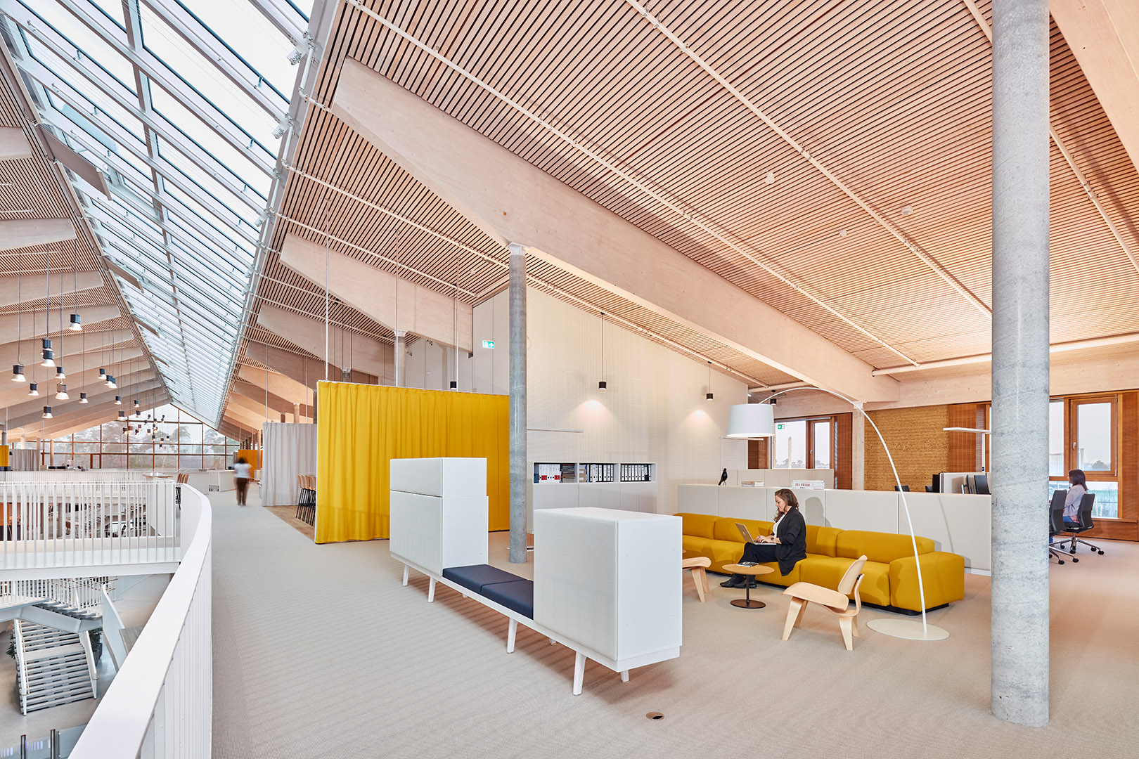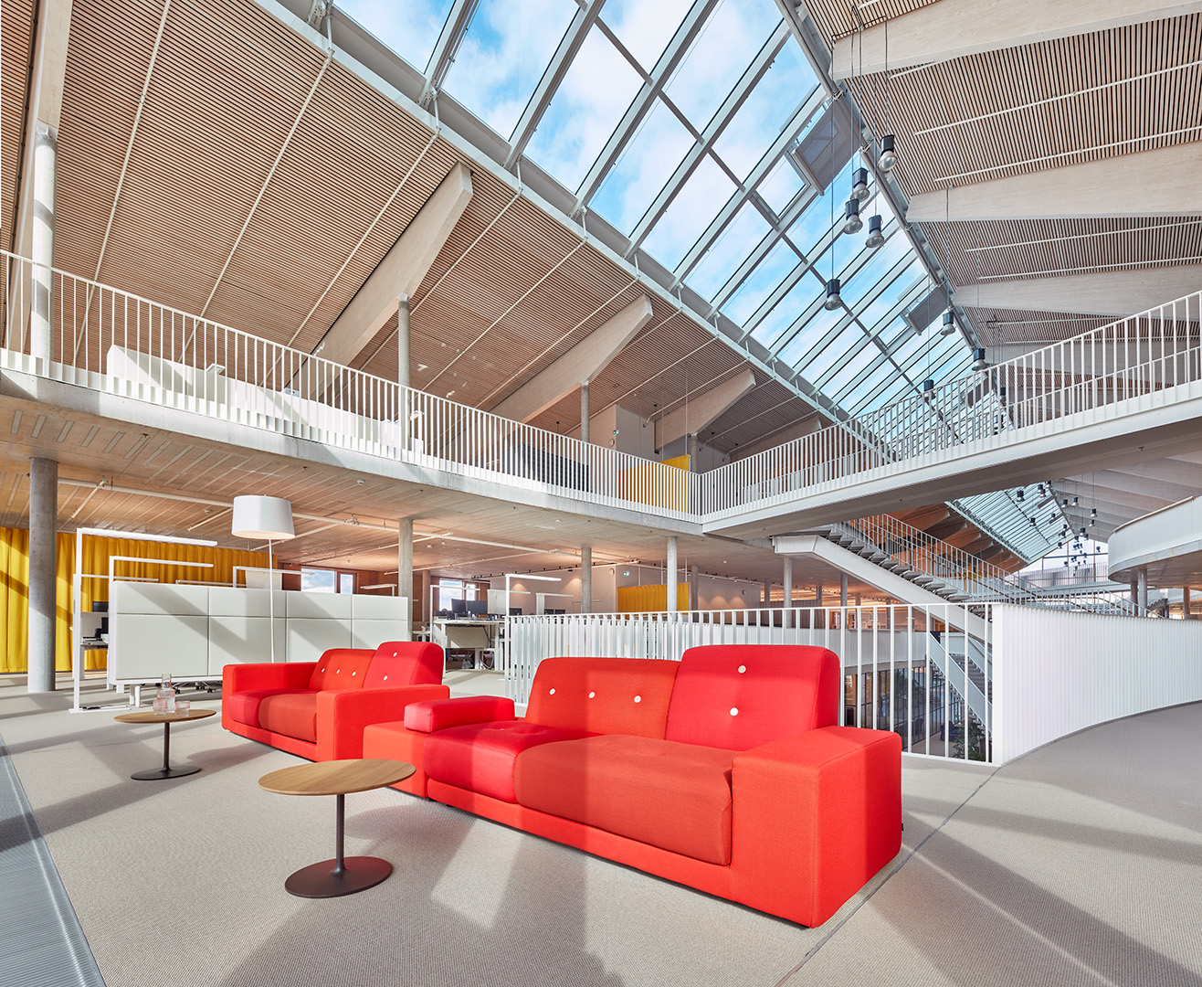"The 'Alnatura Campus' is located on the site of former barracks in southwest Darmstadt. For the planning and implementation of the project, the organic grocery chain embraced the highest standards of modern work culture and sustainability. Their collaboration with Vitra produced an open-plan work environment in Europe's largest office building with a rammed-earth façade. In designing the two-storey office space with work islands, meeting zones and quiet areas for individual retreat, Vitra analysed the company's space requirements and use of workstations, and employees were invited to participate in workshops during the planning phase with a project-specific sample library of structural elements, furniture and lighting. Alnatura had already outfitted its previous offices with Vitra products. As these were still in good condition after up to 25 years of use, it was decided to promote sustainability by keeping these furnishings and integrating them in the new interior.