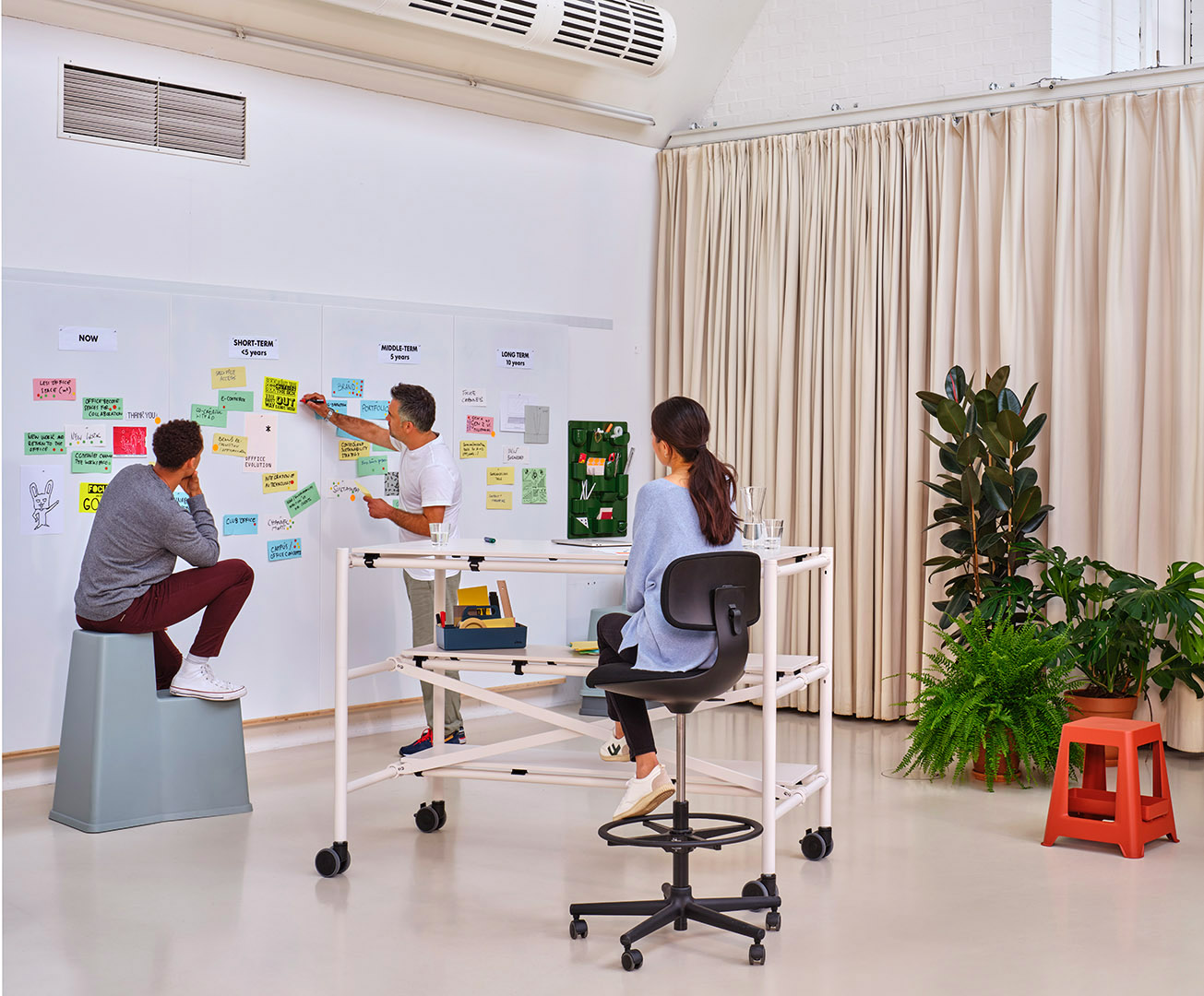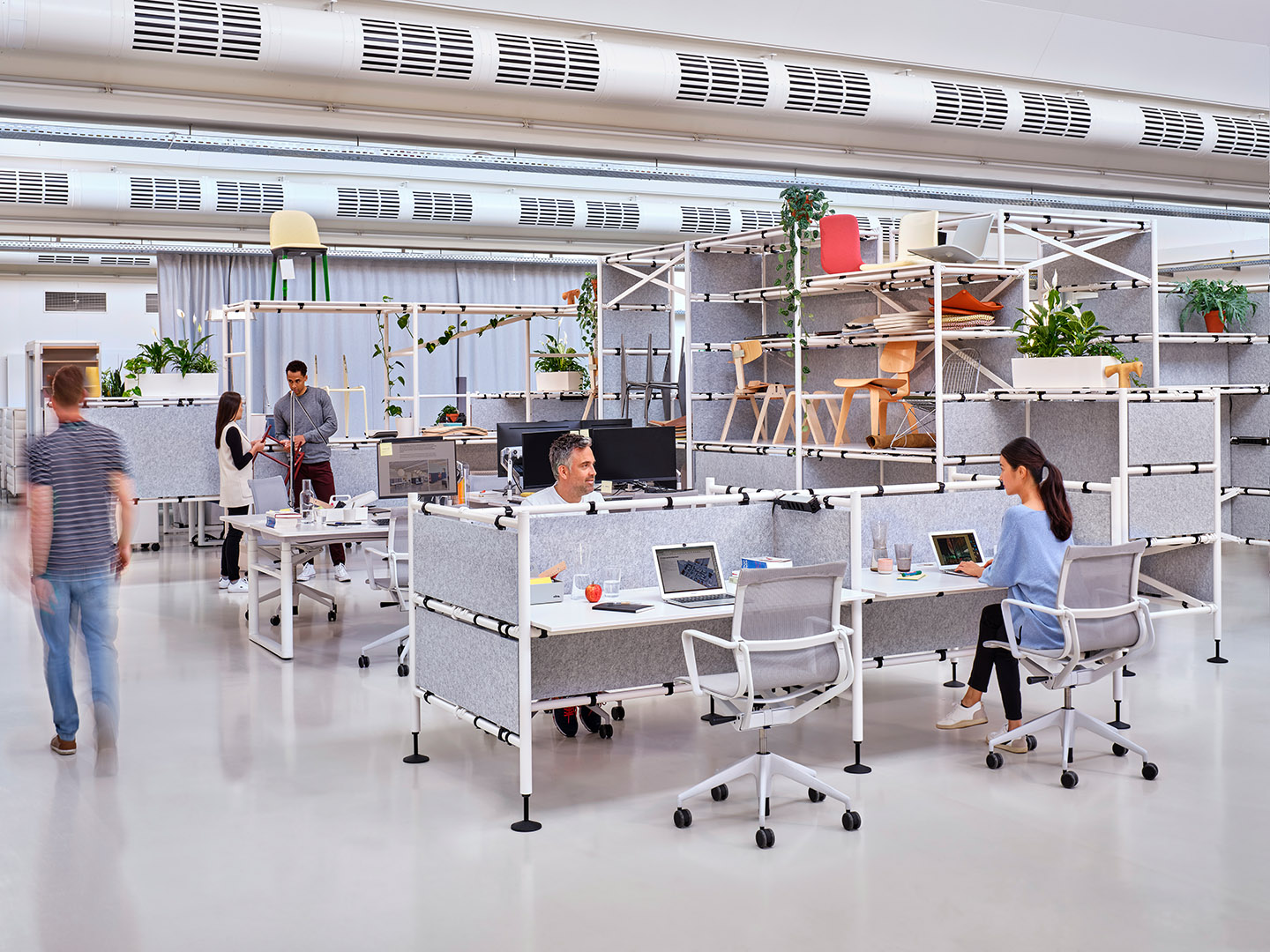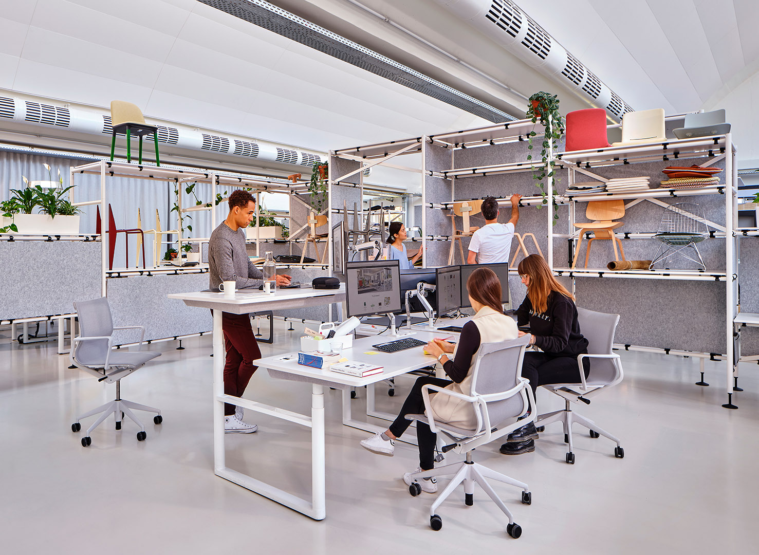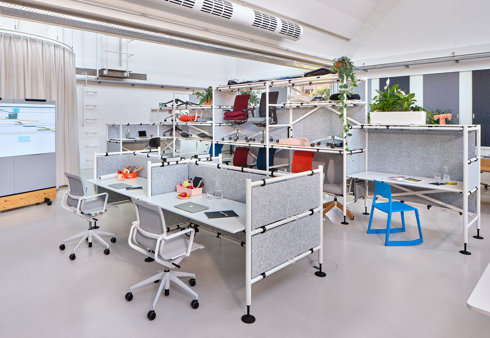 "The office system Comma follows the function and aesthetic of scaffolding, and can be reassembled in different configurations time and again, structuring the work environment as needed." Vitra homepage, https://www.vitra.com/de-de/product/category/office-furniture-systems