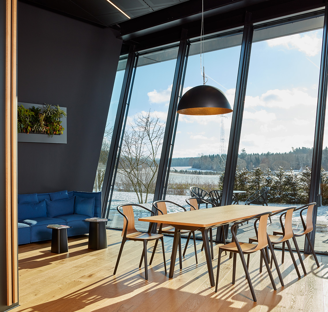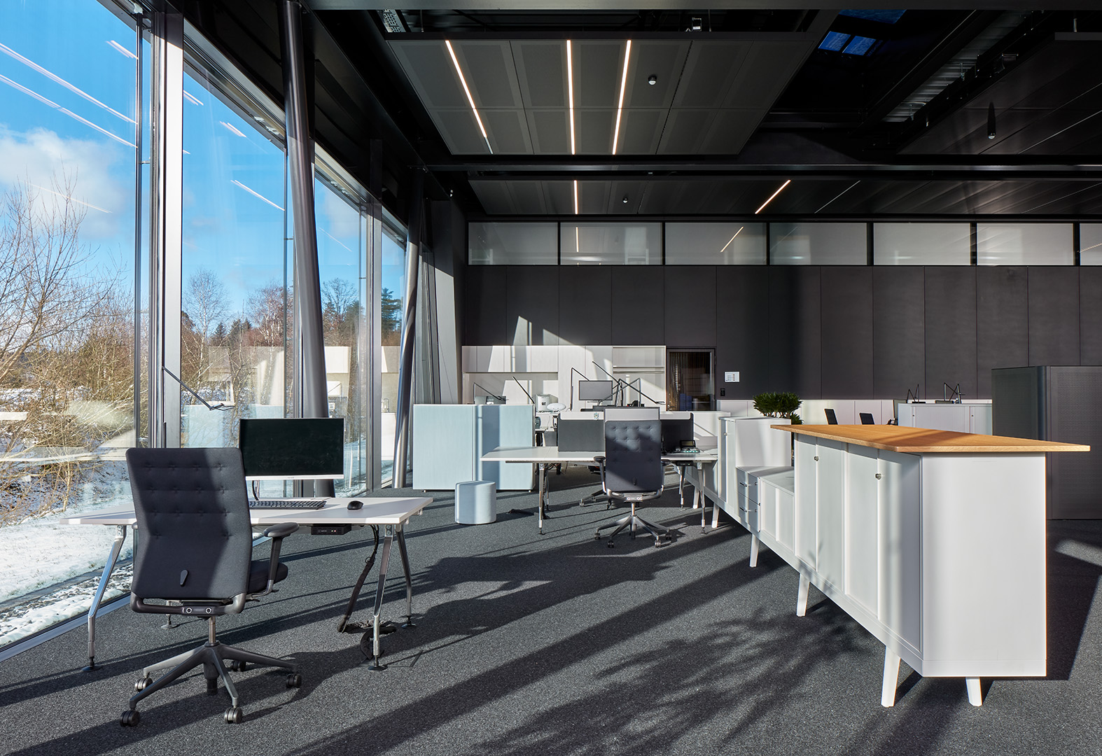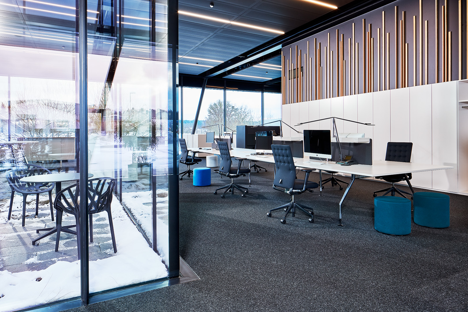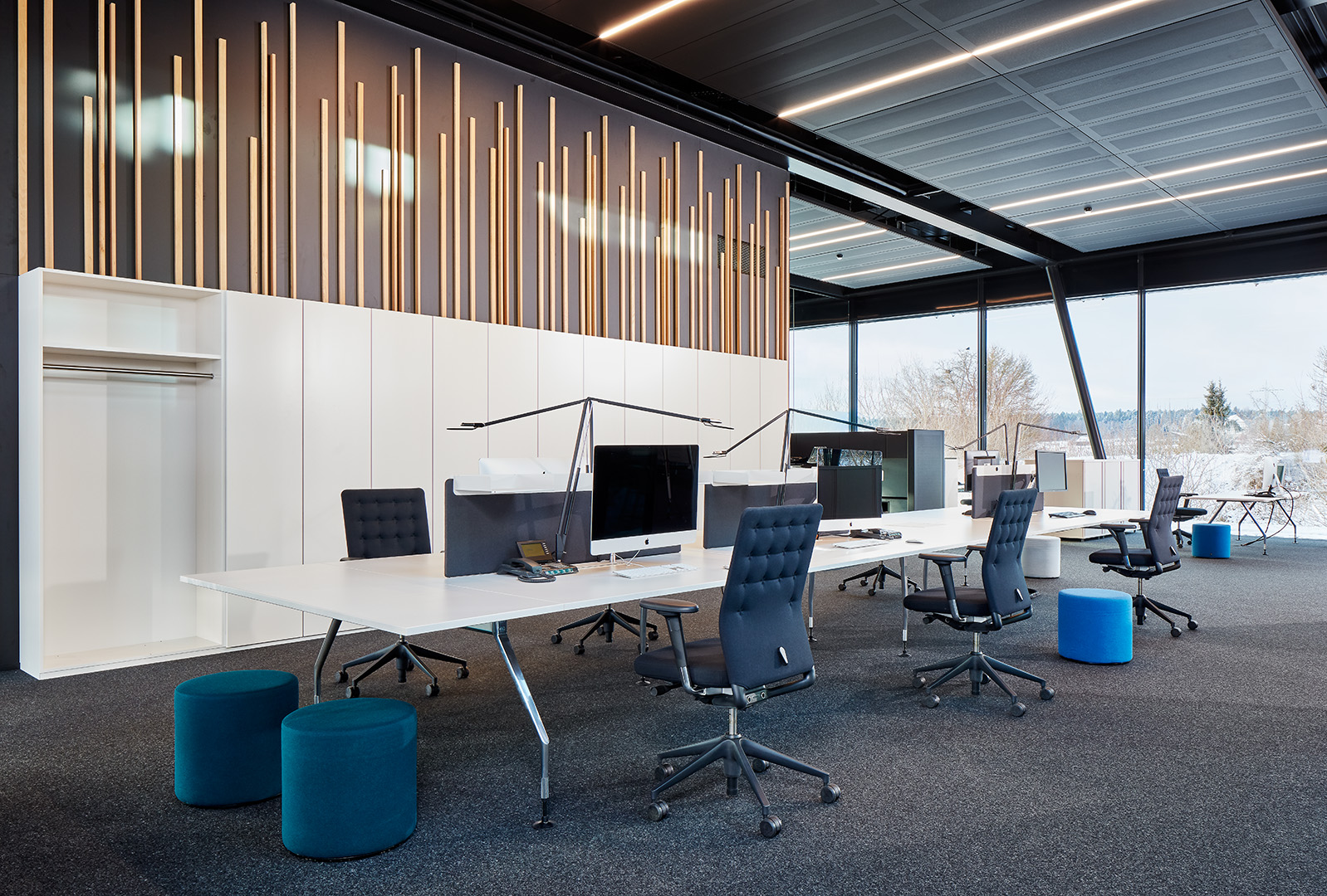 Manufacturer of the famous Steve Job's glasses, Apple CEO. "Constantly growing since its inception 26 years ago, the eyewear manufacturer had outgrown its premises and decided to build a new head office. As senior management wished to sit in the heart of things, the basic concept was an open-plan office layout. A workshop was organised together with Vitra in which issues were raised such as: where does the post arrive, where does it go to then; where and how are design and production coordinated; where are there meeting points for short discussions; where will the printers be; how will we create spaces for quiet retreat; how can we anticipate a rising number of employees etc. Based on the resulting answers and draft planning for lighting and acoustics, Lunor opted for a concept with open and semi-open areas, meeting points for short consultations, and – slightly apart – closed conference rooms. The finished layout is a future-oriented setting that is inspirational to employees. And as Lunor knows about the sustainable benefits of high-quality products from its own portfolio, the entire office was outfitted with Vitra furniture. Architecture: Schmelzle + Partner Architekten Hallwangen. " https://www.vitra.com/en-us/office/clients/details/lunor-ag