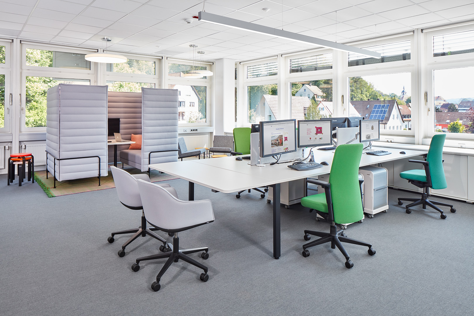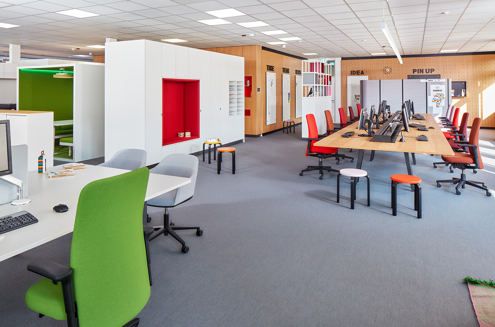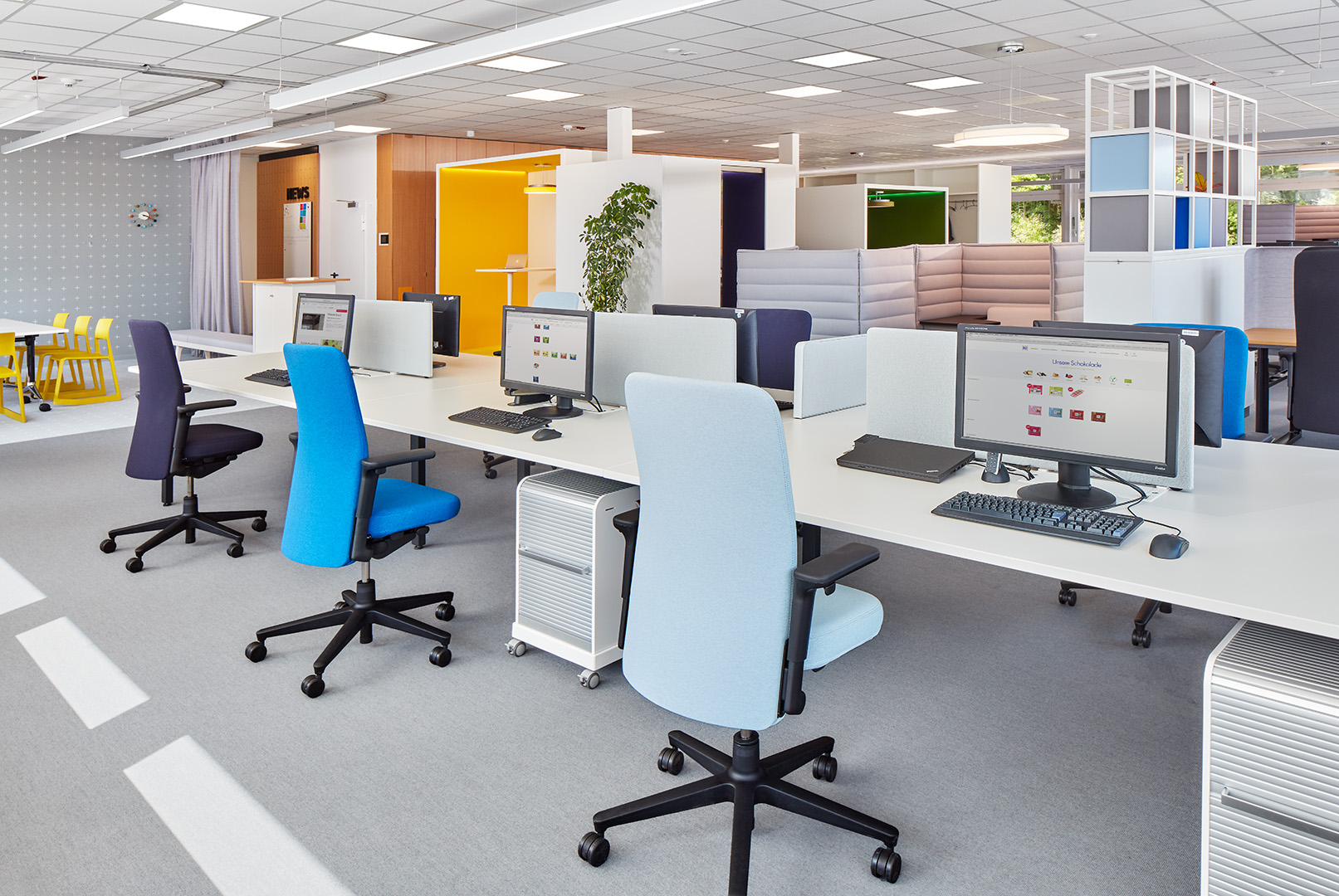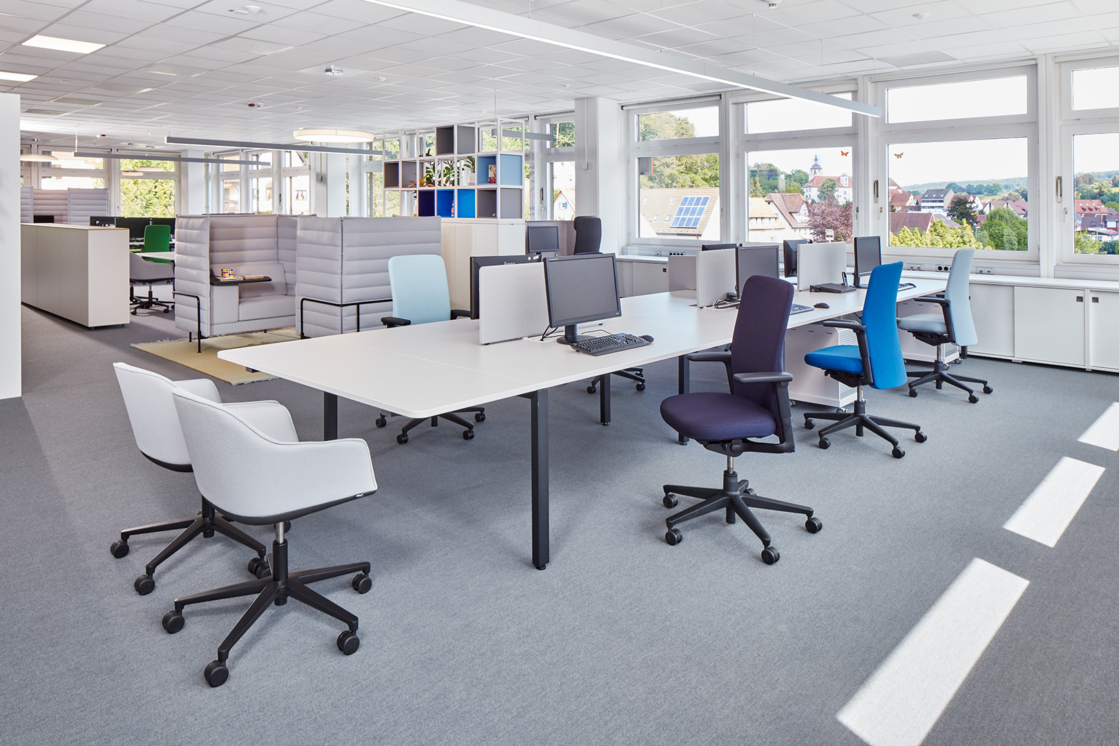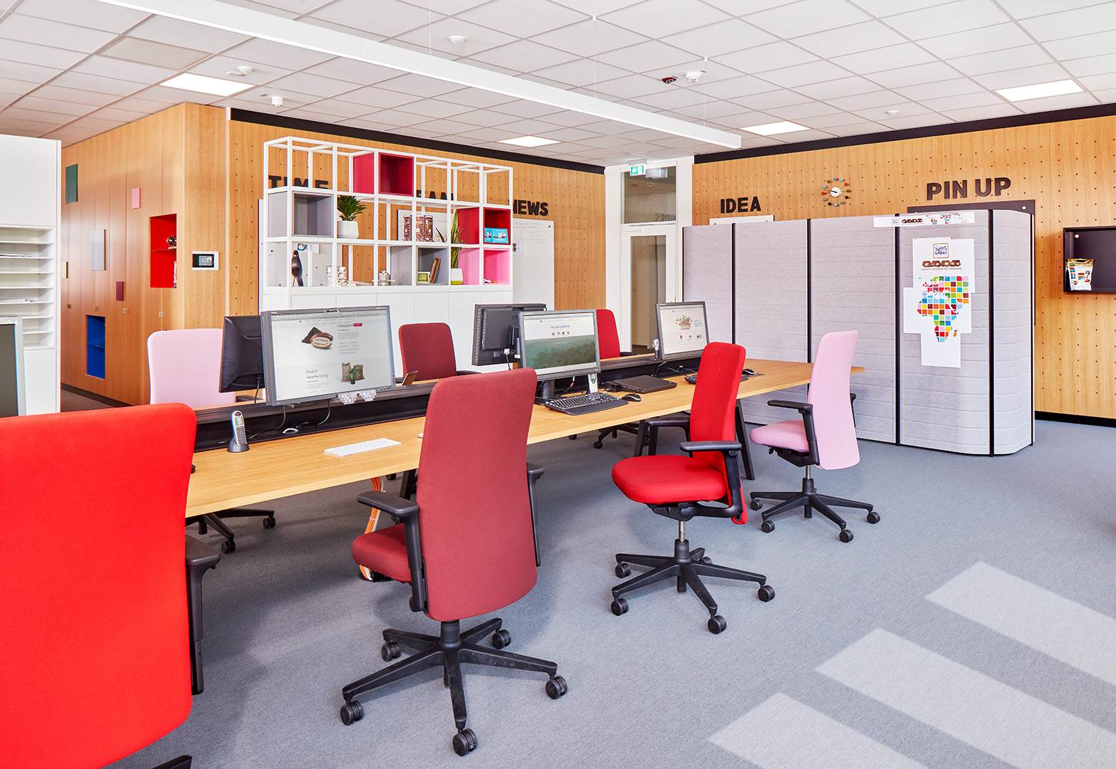 "This long-established German company distributes its chocolate-based products in 100 countries. For the purpose of improving communications and simultaneously optimising the use of floor space at the corporate headquarters, single and group offices are to be replaced by an open-plan work landscape. The decision was made to test a new layout in a delineated area within the framework of a pilot project. As each department has different requirements, Vitra involved the employees in planning workshops to evaluate the range of needs and then developed a concept for the pilot office, which was selected by the company for implementation. An especially striking feature is the choice of Pacific Chairs in many different colours, referencing the similarly colourful spectrum of the firm's product portfolio. The pilot design is being used by a department of about 30 employees, and an analysis shall determine whether this concept will be rolled out over the entire office space. Interior architecture: Vitra." https://www.vitra.com/en-us/office/clients/details/ritter-sport