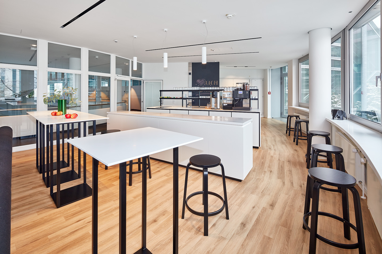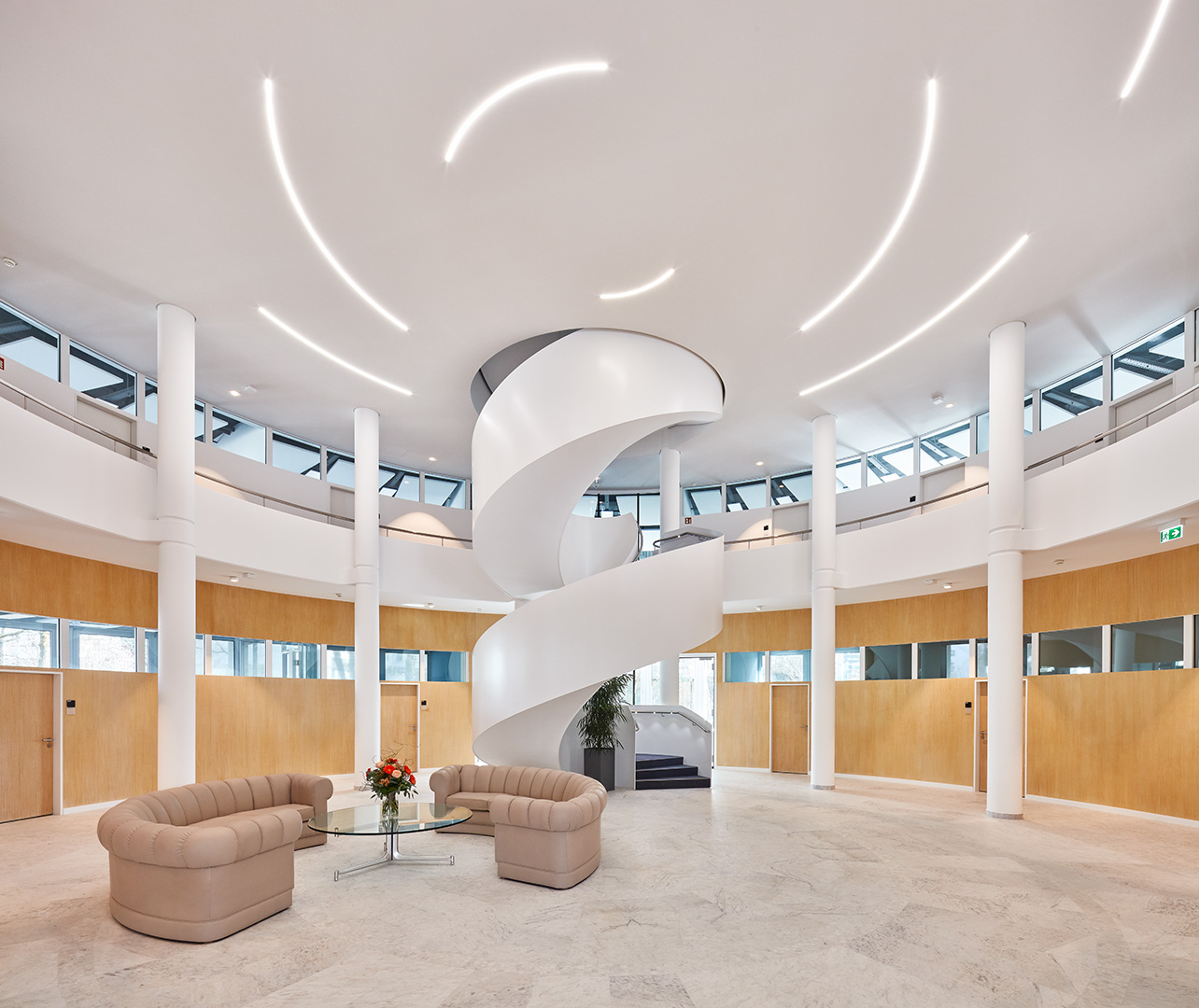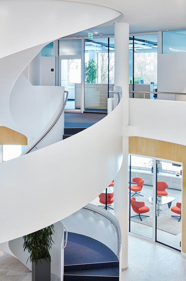 It was essential for the client that the interior conveys its corporate identity and values – to employees, customers and visitors alike. A good example is the so-called atrium: a large round space that was previously poorly used. Through its new function as a creative multimedia room, outfitted to allow flexible use, it is now a highlight of the premises and a staff meeting point.
